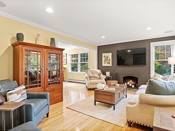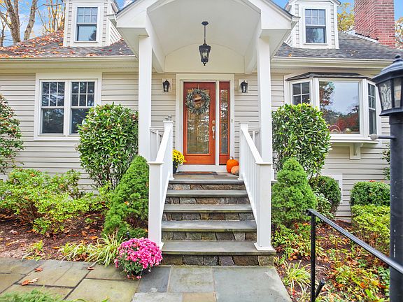 Private and peaceful 1.3 acres boasts a charming, updated three-bedroom, three full bath Cape with inviting deck and idyllic backyard on a quiet cul-de-sac. Main floor offers renovated marble-clad kitchen with skylights, bar seating and stainless appliances; dining room with sliding doors to deck; living room with wood burning fireplace, office, bedroom and full bath. Upstairs are two large bedrooms and full bath. Comfortable family room, gym, laundry room, storage and full bath comprise walkout lower level, remodeled in 2012. Detached barn features heated two-car garage, versatile workroom, spacious top floor with potential for office/studio and two lower level horse stalls, suitable for storage. With two garden sheds. Convenient to Merritt Parkway and New York border.