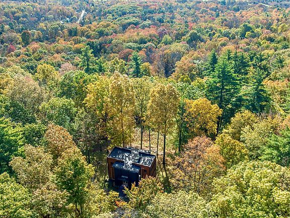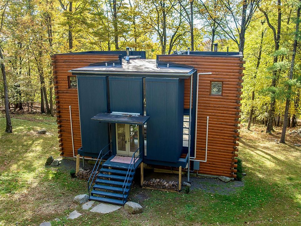 This striking glass and steel residence rises from the woods like a piece of sculpture, pairing industrial structure with natural form. Built in 1994 and inspired by Brutalist design, it combines a steel framework, concrete foundation, and log-stack cladding—an unexpected fusion of raw geometry and organic warmth. A soaring two-story glass curtain wall anchors the facade, flooding the interiors with light and blurring the line between architecture and landscape. Inside, a three-story steel and concrete staircase connects open living spaces with exposed beams, maple flooring, and clean industrial detailing. The Varenna-Poliform kitchen with Sub-Zero, Bosch, and Boffi fixtures sits at the core, overlooking the living area centered on a Wittus Trendline-2 wood stove. Upstairs, the primary suite features Ann Sacks limestone finishes, a deep soaking tub, and skylights as well as an additional bedroom; the lower level offers a flexible studio or guest suite opening to a stone patio and hot tub. Set on 4.3 wooded acres framed by ancient stone walls, forest, and western views toward Mohonk and the Shawangunk Ridge, the property offers complete privacy while remaining minutes from Stone Ridge, High Falls, and Accord. Nearby highlights include Inness, Arrowood Farms, and Westwind Orchard for dining and live music, as well as Mohonk Preserve and Minnewaska State Park for world-class hiking, climbing, and mountain biking. Kingston’s galleries, markets, and restaurants are a short drive away.