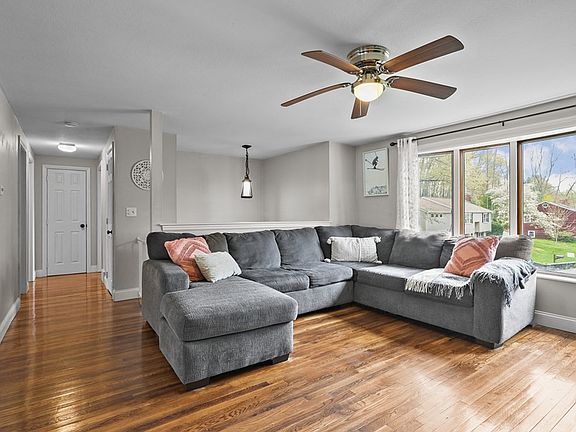 Renovated home sits on a cul-de-sac with a private half acre lot. Updated eat-in kitchen with granite counter tops, tile backsplash and stainless steel appliances. Main level includes original hardwoods with new bath and two bedrooms. Finished lower level has additional living space with wood burning fireplace, a third bedroom, second full bath and storage space or recreational room. The spacious deck off the kitchen over looks a private yard with built-in fire pit and views of the wooded conservation land. A young roof, septic, central air and heating system, making this a perfect turn-key opportunity.
