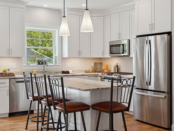 NEW CONSTRUCTION! Welcome to Juniper Commons, a new 50-unit townhome pocket community in a great Portsmouth location. Abutting vast wooded conservation land, this beautifully landscaped community will feature three bedroom, three bath townhomes. This larger unit which has a two-car garage entry that leads into a finished first floor space ideal for an office, or mud/storage area. Up the hardwood stairs the living level is an inviting open layout with high ceilings, hardwood flooring, and great natural lighting. The spacious living and dining area opens to beautifully finished kitchens including cabinetry to the ceiling, pantry storage, oversized island, stainless appliances, and high end stone countertops. Sliding glass doors off the kitchen leads to a private deck space. The third floor has three bedrooms and two baths, including a primary suite with walk-in closet, and bath with tile shower and glass enclosure. Hardwood flooring throughout all bedrooms and living areas. Central air. Professionally landscaped community with community park, sidewalks, and trail leading to the lush wooded open space behind the homes for all to enjoy!