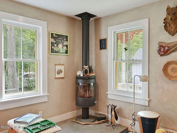 Built in 1885, this unique folk Victorian lake house with stunning second floor wall of windows has been carefully restored and updated with a focus on craft, efficiency and preservation of historic materials. From custom bluestone countertops and hearth stone, half round steel gutters, wood storm windows and built-in cabinetry (crafted from hemlock salvaged from the house itself), to restored douglas fir and red oak flooring and Venetian plaster wall treatment, every corner of this house has been thoughtfully considered. Even the laundry nook combines charm and upstairs convenience. Comfort, peace of mind and energy efficiency are provided by upgraded insulation throughout the home, PVC plumbing, 200 amp electric, mini split heating and cooling, and a sophisticated and highly efficient Morsø combustion wood stove. Numerous windows and open spaces provide natural light and an airy, welcoming feel. The enclosed back porch with baseboard heat extends the living space for dining, indoor/outdoor storage, creative pursuits or just taking in the view. Outdoors, you'll find the use of bluestone continued in the patio and walkways, pollinator perennial gardens, a sunny fenced-in area, and a lovely balance of woods, open space and privacy with only a handful of neighbors and nature abounding. Tiered decks and gentle steps take you down to 58 feet of lakefront access that offers year-round opportunity for recreation and peaceful enjoyment. You've got winter ice thick enough to skate on or to establish your fishing spot. Enjoy autumn colors reflected on rippling waters. Rest easy knowing that the surrounding viewshed is in a conservation easement, protected from development, and motorized watercraft are prohibited (except those with trawling motors for fishing). This is a birdwatcher's paradise with woodland, wetland and riparian habitats and 22-mile Wallkill Valley Rail Trail across the lake. Even so, you are a quick 6 minute drive into Rosendale and 10 minutes to Kingston for shopping, a direct bus to the city, entertainment and other amenities. This property is truly a best of both worlds, once in a lifetime opportunity nestled on a quiet hill on the western edge of Fourth Binnewater Lake.