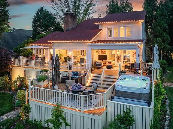 A contemporary haven on the shores of Lake Hickory. Main channel views, harmonizing w/ private gated courtyard boasting verdant foliage & tranquil fish pond w/ cascading rock waterfall. Interior offers a refined comfort w/ vaulted ceilings soaring above heart of pine floors & a brick gas fireplace anchoring the open layout. Gourmet kitchen features custom maple cabinetry, silestone counters & stainless steel appliances including an island gas cooktop, ice maker & wine cooler. Primary suite on main w/ fireplace & direct access to the deck. Ensuite bathroom, w/ tumbled travertine shower, dual sinks & a custom maple built-in walk-in closet. Secondary bedrooms upstairs w/ a loft offering a bird's-eye view of the main level. As the sun rises over Lake Hickory, the home transforms into an entertainer's paradise. 2-story dock w/ boat lifts & an observation deck, combined w/ the sprawling 2-level deck is perfect for hosting gatherings against the backdrop of the lake's breathtaking panorama.
