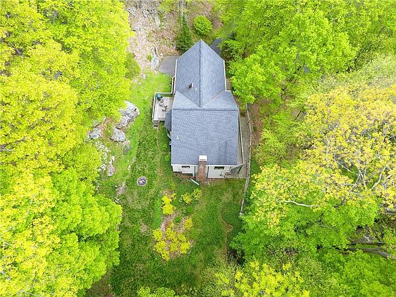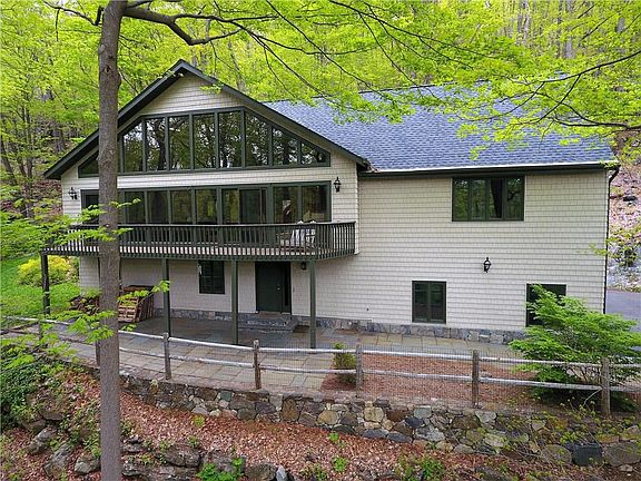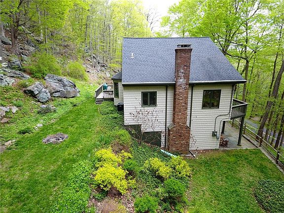 Perched on hillside with breathtaking panoramic views. Sun filled spacious rooms. Hardwood floors throughout. Open floorplan! 3 floors of finished space. Large eat in kitchen offers stainless steel appliances and breakfast bar with seating for 3. Separate breakfast nook. Laundry hook up in pantry. Living room with 2 story chalet style windows - UV glass. Walk out to large deck from living room. First floor master bedroom suite with walk in closets! 2 additional bedrooms on upper level and full bath. Main level greets guests into spacious foyer and bonus room with fireplace. Cedar closet. Oversized 2 car garage. 3+ private acres. New siding 2009 by Don Sturges. New water pressure tank added in 2012. New roof 2008. House recently painted.
