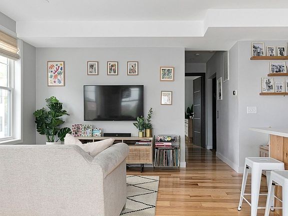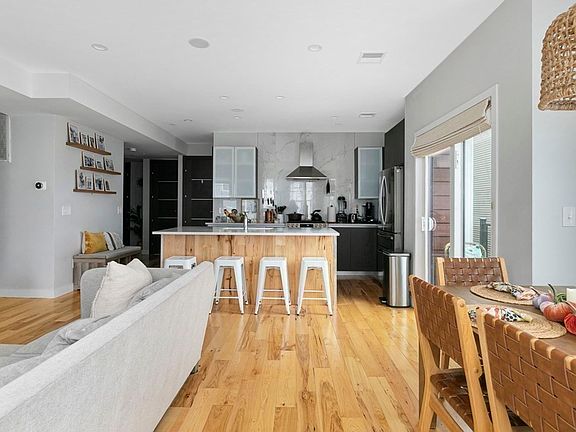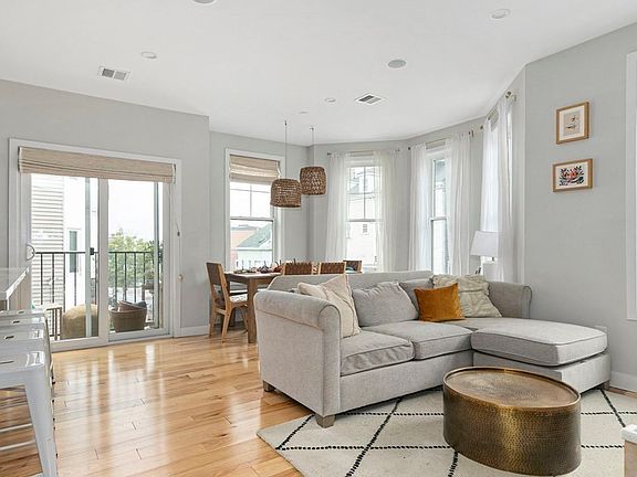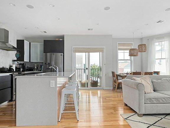 Spectacular sun-filled 2 bedroom, 2 full bath home with direct elevator access to unit. The condo was newly built in 2020 with superior craftsmanship and quality with high-end finishes. Open floor plan w/spacious living-dining area. The kitchen features 3D tile backsplash and accent wall, quartz counters, custom two-tone cabinets, including frosted glass facings. The bathrooms includes patterned tile with floating vanities. Generously sized primary bedroom suite with attached bath and walk-through closet. Laundry in unit, sliders to balcony, storage space, and garage parking for 1 car completes this home. The condo is a short distance from the water and close to excellent restaurants—Reel House, Angela's Café, and Santarpio's. Fantastic financing available from First Republic Bank for owner occupant at 4.75% for this property!!!