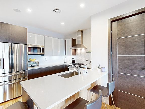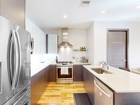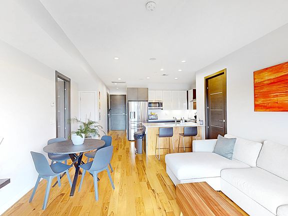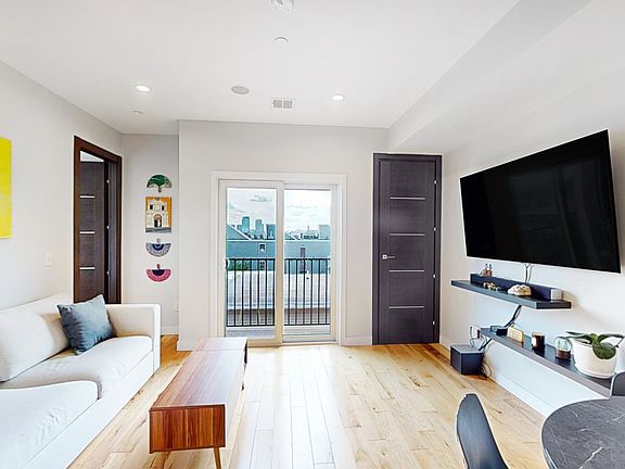 Stunning modern 2-bedroom condo with private roof deck and panoramic skyline views! This sunlit home showcases an open layout with wide-plank hardwood floors, recessed lighting, and oversized windows throughout. The spacious living area flows into a sleek, fully applianced kitchen with quartz countertops, a peninsula breakfast bar, and stainless steel appliances including a gas range and French-door fridge. Step out from the living room to a private balcony perfect for morning coffee or evening relaxation. The primary suite impresses with a custom walk-through closet and spa-inspired en-suite featuring a wood-accent glass shower. The second bedroom offers great light and closet space, while the second full bath is finished with designer tile and a modern palette. Enjoy central air, in-unit laundry, and one garage parking space. The highlight: a private roof deck with sweeping views of Boston's skyline. Moments from the Maverick T, waterfront parks, and East Boston's top restaurants. Available 9/1. No pets. Graduate students OK. Tenant pays gas and electric. First, security, and broker's fee due upfront.