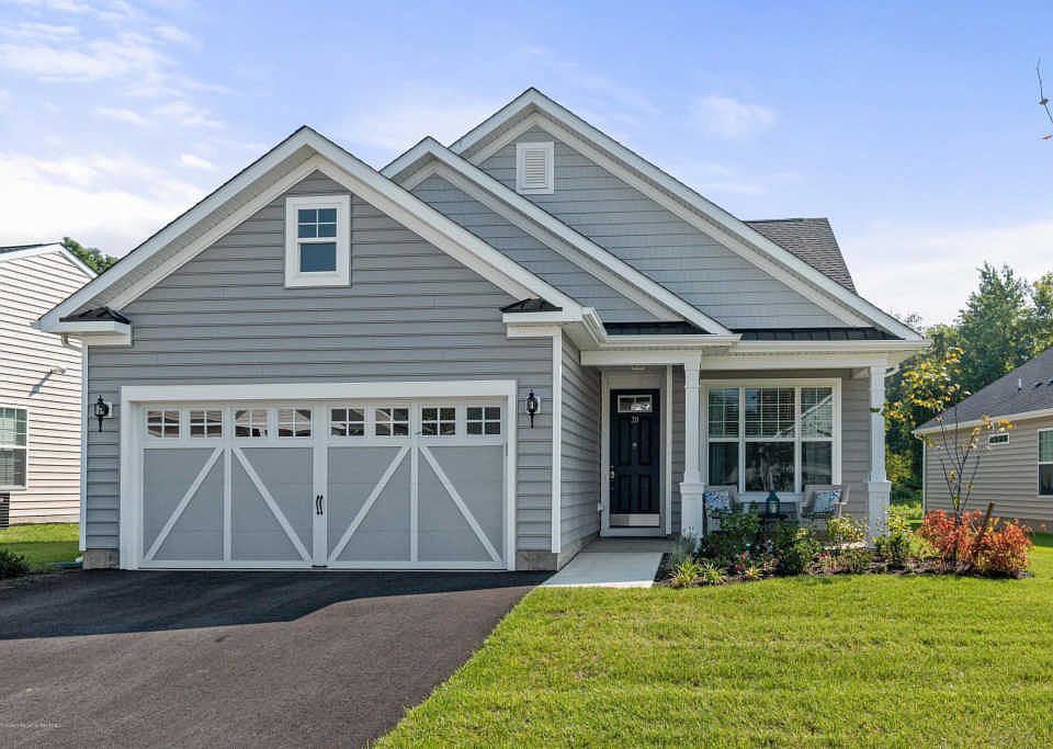 Stunning JUST BUILT home in Four Seasons - Monmouth Woods is available without the wait and cost of building AT A HUGE DISCOUNT. 2 bedrooms PLUS spacious and bright den/office makes this Grenada model so desirable. You won't want to miss out on this private premium lot backing to woods. Clean lines, gorgeous finishes, lots of upgrades including impressive flooring, covered front porch, gourmet kitchen with beveled tile backsplash and granite, cabinet depth stainless fridge, recessed lighting, granite bathroom counters, and all new custom window treatments. Opportunity to purchase the furniture in the home as in photos! 2 car garage leads to a wonderful laundry/mudroom and plenty of closets and storage. Check out the beautiful Clubhouse and all of the amenities of the Four Seasons!