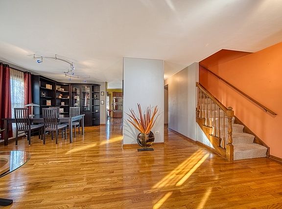 Lovely cul-de-sac location Winchester Model in Foxmoor. Fantastic floor plan with an updated kitchen that offers stainless steel appliances & glass backsplash. The kitchen and eating area flow nicely into the family room with vaulted ceilings and a gas or wood burning fireplace. Hardwood floors throughout the first floor. Huge deck gives you tons of room to enjoy the outdoors, entertain and dine el-fresco. Finished basement offers a large rec room area & storage space. Upstairs is 3 bedrooms and 2 full updated baths. This home has been lovingly maintained with newer windows, furnace, A/C and hard wired for surround sound. Close to schools, the metra, shopping and dining. Simply unpack and you're home!