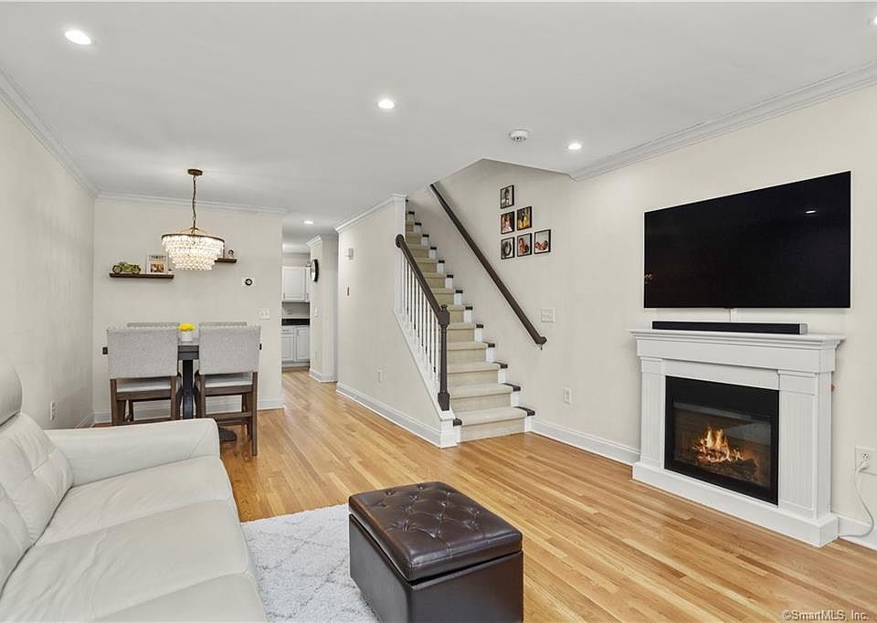 Move-in ready, renovated spacious townhome tucked away off the street in Glenbrook. Natural light pours into the open concept main level with newly refinished hardwood floors, crown molding throughout, and recessed lighting. Sparkling eat-in kitchen w/ white cabinets, granite countertops, new st/st refrigerator, new st/st range, and new st/st Hood exhaust which vents outside. There is an updated powder room on main level as well. Second floor features Master bedroom with stunning vaulted ceilings, walk-in closet, Full bath, new custom linen closet in hallway, and a spacious guest bedroom. New Hardwood floors (2019) throughout second floor! Bonus sunny and spacious Loft on third floor can be used as playroom or media room or optional 3rd bedroom. The tiled, finished lower level has laundry, and is a great bonus space for a gym. 1 Car Attached garage with 1 outdoor parking space. Dual zone HVAC features gas heat and central air, gas hot water heater, Nest thermostats, & WiFi Garage door opener. Investor friendly, rentals allowed and low HOA fees. Well maintained and manicured complex that is also pet friendly! Commuters Delight, just a short walk to Glenbrook train station, hiking trails at Woodland Park down the street, and minutes to I-95, Cove Island Beach and restaurants in Stamford & Darien.