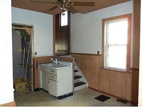 West side 2-story in need of fixing up. 3-car detached garage. 21x6 enclosed front porch. Full poured concrete basement. Circuit breakers.Large unfinished walk-up attic. Plenty of room. Bank-owned property being sold "as-is".