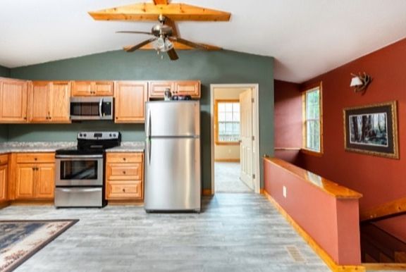 MOUNTAIN LAUREL LN...great location just minutes from downtown Blue Ridge. Brand new kitchen with oak cabinets, and new stainless steel appliances. Features include 2 BedRm, Kitchen and 1 full bath on main, vaulted ceilings and open deck. The large Bonus Room / Living Area w corner woodburning heater is on terrace level along with a half bath and Lots of room to expand for additional 3rd BedRm. Gentle lot with access parking to both levels and the garage has an extra high ceiling for good storage possibilities. This location was formerly used as a home office and cabin rental company, residential or commercial.