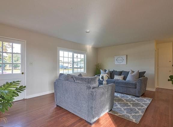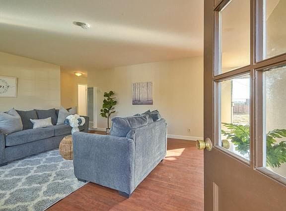 This tastefully updated home welcomes you with an open layout. Step into the spacious living room that is flooded with natural light. Off of the living room you find yourself in the dining area with new laminate flooring and sliding door access to the backyard. The updated kitchen features new stainless steel appliances, new cabinets and granite counter tops. The bedrooms all have newly installed carpet. Restrooms have been updated with new toilets, vanity and shower tub. Ample space in the two car garage with washer and dryer hookups. The large backyard has two storage sheds, built-in bbq pit and backs to agricultural land.