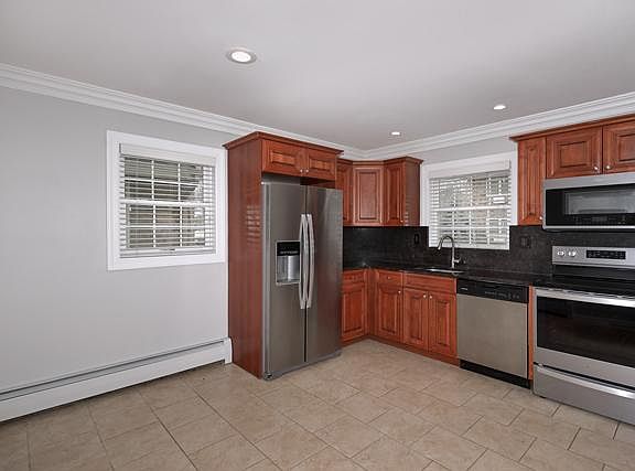 Woodgrain style window treatmentsGray paintStainless steel appliancesCrown moldingHigh-hat lightsBluestone entriesCeramic tile