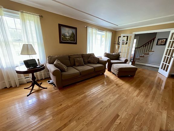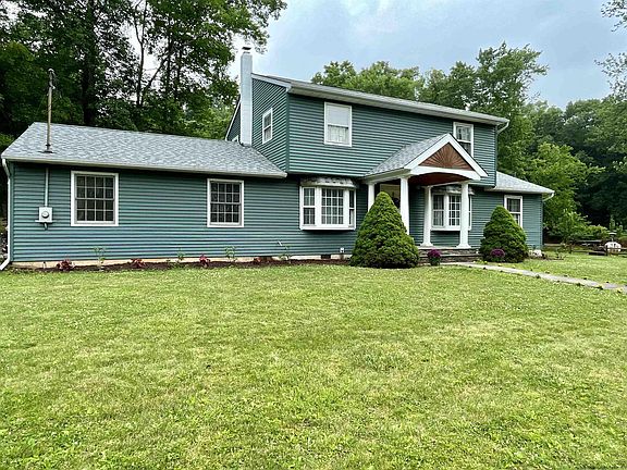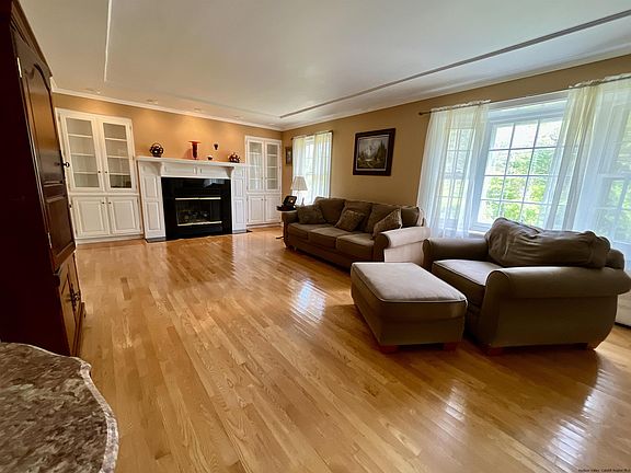 WOODSTOCK TWO-STORY HOME WITH LUXURIOUS ADDITIONS Meticulously updated 3 bedroom, 3 bath Colonial style home offers nearly 2,200 square feet of living space and is located minutes to the center of Woodstock. This ready-to-move-in, corner lot home has many desirable features. As you step inside you are greeted by granite floors, a beautiful staircase and French doors. To the right is a spacious living room with fireplace and custom shelving with cabinets on both sides. To the left, the formal dining room includes a brilliant Swarovski crystal chandelier. Steps away is the downstairs full bath. A large custom-designed cherry wood kitchen with granite counter tops, island and plentiful storage allows you to host large gatherings for family and friends. As you walk through the additional room, currently used as an office, you find yourself awash in daylight in the window-filled sunroom, suitable for use year-round. Via the sunroom or kitchen you have access to the newly renovated, enclosed screened porch which looks out to the .73 acre tree lined yard. The back entrance, located inside the porch, opens to the laundry area featuring a matching large-capacity washer and dryer. The second floor holds three bedrooms and two full bathrooms. The master bath features a shower, separate Jacuzzi tub, heated towel rack and toilet with bidet. The vanity has a granite top. A large two car garage stores a 375 gallon oil tank, water softener, storage cabinets and a new furnace. There is also a summer/holiday kitchen should you require additional cooking equipment for events. It contains a refrigerator, microwave, wall oven and electric flat glass stovetop. Updates include: new furnace, gas fireplace, sun room, enclosed screened porch, pond with waterfall, 8 by 12 foot hobby greenhouse, two storage sheds, fenced in garden as well as fenced backyard great for barbecues. This rare opportunity to make Woodstock your home awaits.
