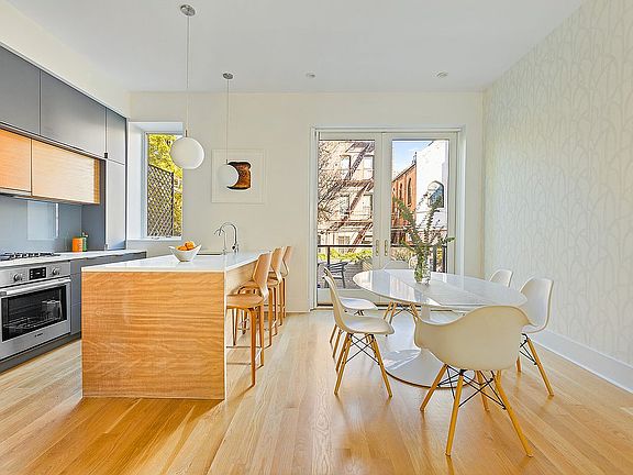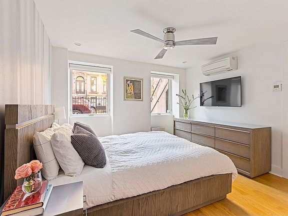 Occupying the entire parlor, garden, and basement levels of a 20’ brownstone this home offers 2,341 square feet of living space plus over 1,000 square feet of private outdoor space. This charming pre-war condo is totally unique and is a genuine townhouse alternative. You enter at the parlor floor where you are greeted with a huge, full floor /dining/entertaining space with gorgeous chef’s kitchen. This floor has 11’ soaring ceilings, five huge windows, northern and southern exposures, a gas burning fire, and a beautifully appointed powder room. The kitchen has custom cabinetry and a suite of Bosch and Liebherr appliances . At the rear of this floor, French doors lead on to a deck of architectural glass with steps leading to the huge rear yard. The centerpiece of the garden is a mature fruit producing apple tree which provides lovely fruit in the fall and wonderful shade in the summer months.