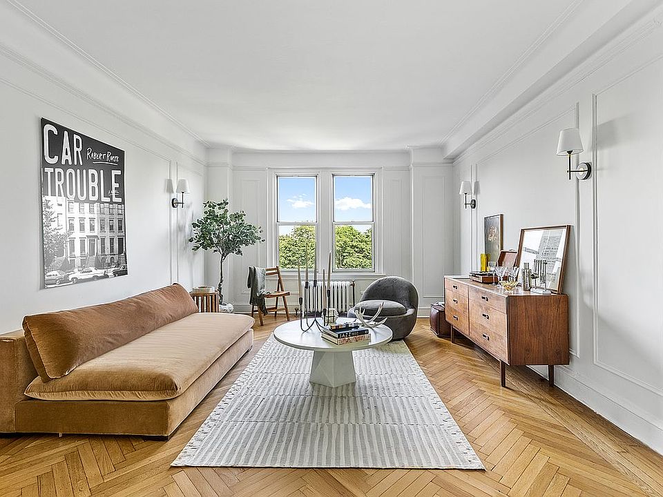 Residence 6B is a spacious haven rarely found in Brooklyn, boasting original details such as dormers, crystal doorknobs, and picture frame molding, all meticulously preserved to perfection. A whimsical new tile bath adds a touch of contemporary flair, while six windows frame unobstructed park views, offering a serene backdrop for relaxation and contemplation.