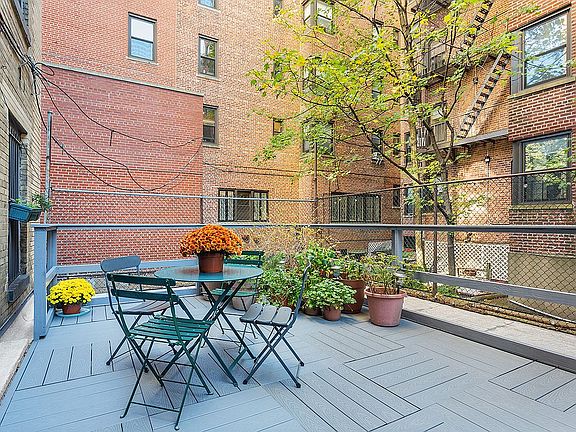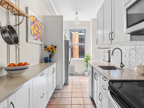 The recently refinished original herringbone hardwood floor is absolutely the star of the living room. Since you are on the lobby level, you can enjoy the floor in all its un-carpeted splendor if that’s your vibe. The large sliding glass doors in the living room lead out to your own private oasis that is quietly tucked away in the back of the building. The brand new Trex deck is perfect for entertaining, gardening, and simply enjoying a nice breezy breeze with the doors open. The updated galley kitchen has abundant counter space, white cabinetry with lots of storage, and room for a cafe table next to the window.