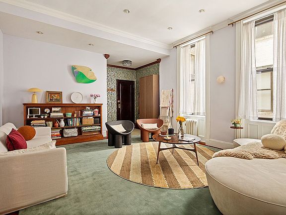 Soaring 10+ to 11-foot ceilings and north, east, and southwestern exposures create a sense of openness and warmth throughout the property. The welcoming foyer leads into a gracious living room anchored by original hardwood floors, tall windows, crown molding and period doors.