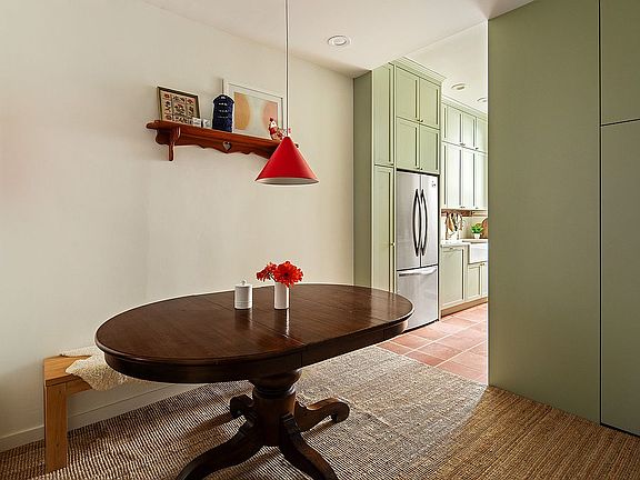 In 2024, the home underwent a stunning renovation of the kitchen and dining area. The windowed kitchen features custom cabinetry in Farrow & Ball’s Vert de Terre, quartz countertops, and a suite of modern appliances including a Bosch dishwasher, Frigidaire refrigerator and range, and a LG washer and dryer. A dedicated dining area completes this refreshed space.