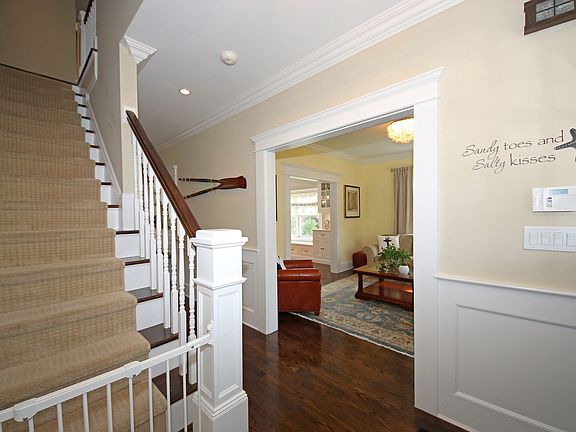 Impeccable Nantucket style Colonial with recent upgrades by noted builder Garrett Wilson. Beach house atmosphere right from the street featuring new windows and shutters with starfish detail. Outstanding finishes and moldings throughout. Entry foyer flows easily to living room. Large opening to formal dining room with built-ins and window seat. Upscale white kitchen with large island opens into family room with gas fireplace. Adjacent to family room/ kitchen is children's playroom with ample storage closets. Mudroom and powder room complete the first floor. The second floor includes master bedroom suite with luxury bath and large walk in closet. 4 Additional bedrooms with jack and jill bath and hall bath. Second floor laundry also nearby. The third floor features a media room with plumbing in place for a wet bar, billiards room or guest room/ aupair suite and full bath. 9 Foot ceilings and hardwood floors. Lower level garage and incredible storage with excellent ceiling height. The private property includes a bluestone patio with gas firepit and barbecue /dining area. Ample grass area suitable for many outdoor activities. Fully fenced level property with irrigation and drip system in place. Walk to beach, town and train. Subject to seller finding suitable housing.