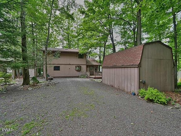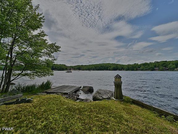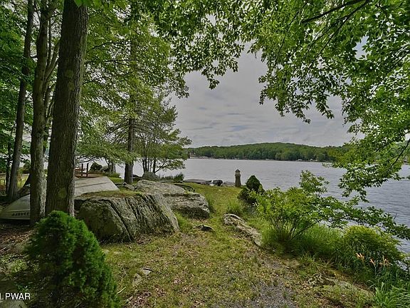 POWERBOATING LAKEFRONT HOME located on Roamingwood Court, one of the most sought after streets in The Hideout, a 4 season amenity filled community in The Northern Poconos, just 2 hours from the NYC and Philadelphia Areas. You can enjoy the sun all day and see the most amazing sunsets! Beautiful private, wooded and level Lot. The home is easily accessible with just a few steps to enter! There's a multi-purpose mud room that can be used for just about anything. The living room has high ceilings, a fireplace and awesome lake views. There's a bedroom and full bathroom on the main level; the 2nd level has two bedrooms including the master bedroom with private bathroom. Plenty of storage throughout and pantry. AMAZING Screened in Porch! This home does need some love, the lot is amazing.