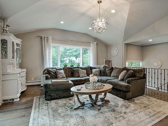 This is not your parents Split Level Tastefully renovated from top to bottom, this striking split level home, nestled on a 2.57 acre wooded lot will exceed your expectations. Light fills the home with its raised cathedral ceiling, skylights & picture window. Open floor plan is fantastic for entertaining & everyday life. Beautiful gray stained wide oak hardwood throughout entire first floor. Spacious eat-in kitchen w/ granite counters & sunny dining area opens through sliders to huge composite wraparound deck. The kitchen opens to a bright cathedral living room w/ floor-to-ceiling engineered stone fireplace w/ energy saving pellet stove. Three bedrooms including spacious master bedroom w/ NEW walk-in closet with built-ins & sliding barn door. Gorgeous new bath features marble tile floor, marble vanity, & stunning tile bath/shower w/ glass doors. Lower level features family room with separate entrance, exercise room, full bath with shower, and office. Close to golf, MBTA train, & Pike