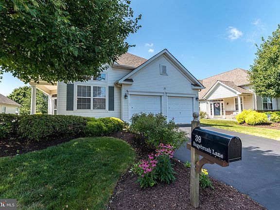 Welcome home to 39 Sagebrush Lane in the much desired 55+ Neighborhood of the Villages of Flowers Mill! Move right into this Winterthur Model, and enjoy main floor living at it’s very best! A covered front entrance leads you into the elegant 2 story Foyer. A formal Living Room with 14 foot Ceiling and a 2 story Dining Room offers lovely space and is perfect for entertaining and holiday events. A double door entry leads you to the open and inviting Kitchen boasting a center Island and breakfast bar. The Kitchen offers 9’ ceilings, solid surface countertops, 70/30 double sink, gas cooking with newer exhaust fan to outside, ceramic tiled flooring and pantry too. A spacious Family Room open to the Kitchen, boasts a Cathedral ceiling and is a perfect area for entertainment or quiet movie nights. From the Family room, a glass door will lead you to a Den/Office and a sliding door will lead you to the rear paver patio with power awning too. A private Powder room and main floor Laundry complete the first floor. The Foyer staircase leads you to the second floor where a beautiful Loft overlooks the Living Room, Foyer and Dining Room. The rear Loft, offers a private area for a 2nd office or quiet reading room. A second spacious Bedroom with double door closet and ceiling fan and a full bathroom just off the loft can be a lovely guest area. There is a Bonus room just off the Loft offering lots of storage or another walk in closet if desired and completes the second floor. This home offers a two car Garage with separate doors, a Lawn Sprinkling System, custom Paver Patio, custom landscaping, hardwood floors, laminate plank flooring, ceramic tile floors, ceiling fans, recessed lighting, security system, newer roof (2019), newer Water Heater (2022), newer A/C (2017) and newer Dishwasher (2021). The Villages of Flowers Mill is a gated 55+ community and offers wonderful amenities. Inside the Clubhouse you will find a Ballroom, Library, Fitness Center, Card & Craft Rooms, Billiard Room, and an indoor Pool. Outside you will find an outdoor Pool, Tennis, Bocce, and Pickleball Courts too! The Association maintains the Common Areas and the Lawn, as well as Trash and Snow removal. It’s time to live the “Good Life” at 39 Sagebrush Lane!