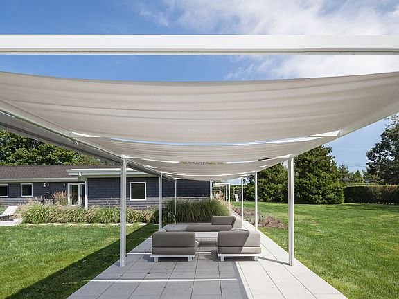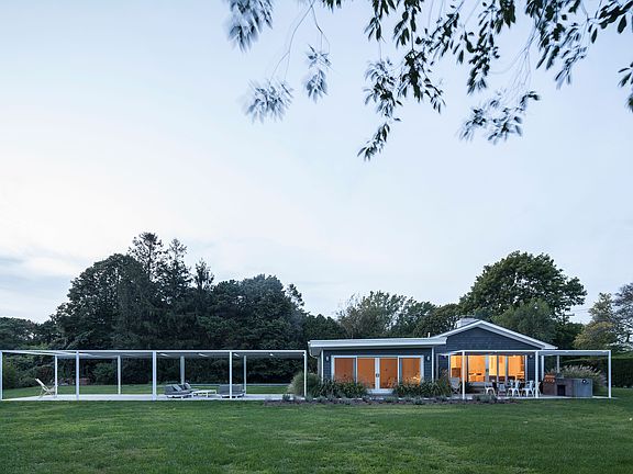 Chic, cool, and bright. This mid-century ranch home on a large open parcel in Southampton has been meticulously reimagined as an indoor and outdoor oasis. A central open living and entertainment space is anchored by a clear through wood burning stucco fireplace, providing a fabulous space for friends and family to gather, or conversely a cozy and intimate area for quiet evenings. A cascading covered patio space is reminiscent of a Cristo installation, and the seamless interaction from indoors to out feels completely organic. With ample garden space for running about, and a gunite pool, this has all the makings of an intimate boutique resort destination.