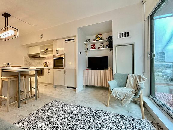 Welcome to your new home! This stunning 580-square-foot, one-bedroom and one-bathroom condo offers both modern luxury and unbeatable convenience. Enjoy the south-facing exposure with ample natural light from both east and west, complemented by the spacious 9-foot ceilings that enhance the open, airy feel. The freshly renovated unit features a decked and newly painted balcony, perfect for enjoying a morning coffee or evening relaxation. Inside, you'll find premium upgrades throughout. The condo boasts a brand-new stacked Samsung washer and dryer, ensuring efficiency and ease. The light fixtures are upgraded to energy-efficient LED options with adjustable color settings, while the kitchen and bathroom showcase beautiful marble-patterned ceramic tiles and luxury vinyl-wrapped cabinets. A quartz countertop and rollout island dining extension complete the modern kitchen. Located in a vibrant neighborhood, you are just minutes away from all your essentials. Within a two-minute walk, you can pick up groceries at No Frills or Rabba Fine Foods, visit the LCBO or Dollarama, and enjoy the St. Lawrence Public Library and Community Centre. The St. Lawrence Market, Distillery District, and St. James Church and Park are just a short stroll away, and the waterfront promenade is perfect for a run, stroll, or dog walk. With easy access to public transportation including buses, streetcars, and the King Subway Station and quick connections to the Gardiner Expressway and Don Valley Parkway, commuting and exploring the city is a breeze. Enjoy proximity to restaurants, George Brown College, the Financial District, Dundas Square, and the Eaton Centre, making this location truly unbeatable. This condo has never been rented and is in pristine, move-in-ready condition. Don't miss this opportunity to own a home where every detail has been thoughtfully upgraded. Make it yours today!