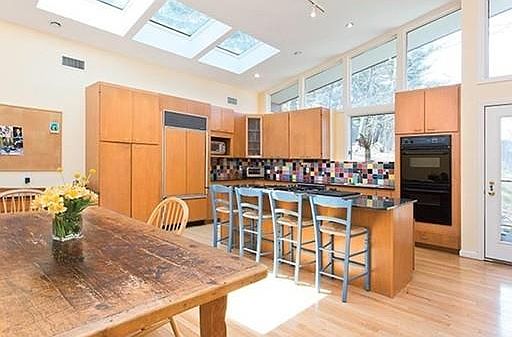 Spectacular five bedroom, four full bathroom Contemporary home has been thoughtfully renovated. Magnificent natural light, soaring ceilings, walls-of-glass and exquisite treetop views, are just some of the features of this lovely home. Entertainment sized living room with floor-to-ceiling stone fireplace leads to a cook's kitchen with granite counters, stainless appliances, center island, abundance of storage and a big dining area. There is a step-down family room off the kitchen with a fireplace and built-in cabinetry.The formal dining room has glass doors leading out to a brick patio. There are three family bedrooms, one of which has an en suite bathroom. The master bedroom has an updated spa-like bathroom, a dressing room with lots of closet storage and a lovely deck. The walk-out lower level has a 5th bedroom and full bathroom. There is also an office and playroom in the lower level. The beautiful setting, yard and proximity to schools and shops makes this house complete.