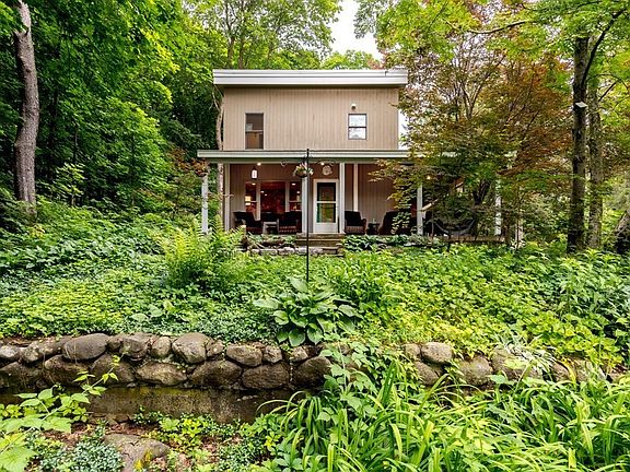 Craftsman Contemporary home boasting cozy intimate rooms interspersed with soaring voluminous spaces overlooking a woodland setting. Warm fir hardwood, cherry cabinets, fireplace, outdoor patio with firepit, and a second floor deck all welcome you to explore within and stay a while. This is a special, tucked away haven in a quiet neighborhood. 2021 Roof, newer AC, oven, fridge, custom shutters and energy efficient blinds add value. The entry hall has huge closets for New England's seasonal outerwear, and the tile flows from there to walk-in pantry & generous Kitchen. DR/ FR have fir floor. The Primary suite is large, with walk-in spacious closet for two, keeps you comfy with heated bathroom floors, sets apart from the rest of the busyness of a house. The laundry room is conveniently nearby. Across a soaring vestibule peeking into the treetops, you wander into the wall of 9' tall storage, a second bedroom, hallway easily used for a library or study area, a third bedroom, & full Bath.