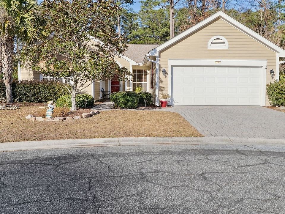 Coveted Hamilton/Jefferson model in Sun City Hilton Head on a cul-de-sac lot just a stone’s throw from Okatie Creek Golf course, restaurant, & bar! This home offers a den/office w/blt-ins (or 3rd bdrm). The open floor plan boasts an inviting gas fireplace, Carolina rm & spacious dining area. Upgrades- bamboo flooring, & interlock flooring in garage, kitchen cabinets, granite counters, SS appls. Bay windows. 4-inch gutters w/ gutter guards. Composite siding. Roof-2013, HVAC-2016. Retractable awning over patio. Beautiful, paved driveway. Conveniently located to amenities, gates, shops & restaurants. Golf cart & furniture available to purchase.