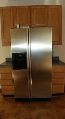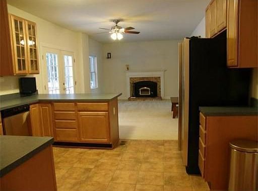 Street lamps crafted by local tinsmith. Sidewalk around the street. Many native plants and trees.