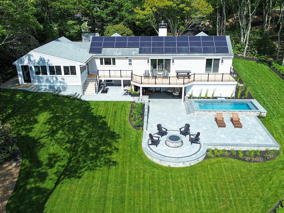 Breathtaking bird's-eye southwest facing views of Buzzards Bay towards Woods Hole and the Elizabeth Islands. This completely renovated four bedroom home with walkout lower level boast ample living space with amazing outdoor space including 1,100 squares of hardscape with gas fireplace along with 9x21 plunge pool also one car direct access garage! The main level features three bedrooms, two full baths, family room, gourmet kitchen, living room with slider to full length deck overlooking your serene backyard. Lower level has the fourth bedroom, full bath, family room walkout to stunning outdoor space. Every detail has been applied to this amazing home. The kitchen sink views are to die for along with the custom built-in cabinets. quartz counter tops, SMEG appliances(Refrigerator, Stove/Oven) make it a chef's delight. Owner owned Solar panels and backup generator allows backup electricity. Come enjoy the views from this hilltop retreat.