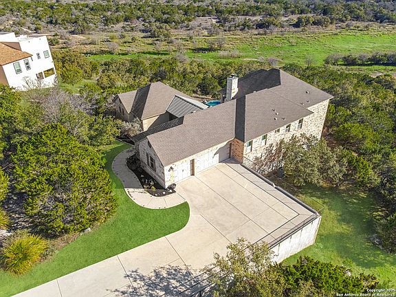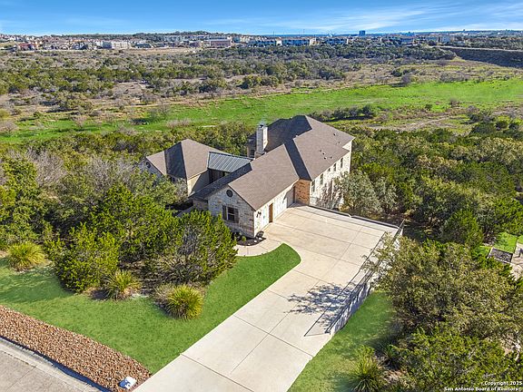 Discover the epitome of elegance and tranquility in this spectacular 5-bedroom, 4-bathroom home nestled in the prestigious, guarded community of Estates at Champions Run. Situated on a sprawling 1-acre lot, this residence backs up to a serene greenbelt and a 288-acre natural reserve, offering direct access to an idyllic trail leading to Stone Oak Park. Inside, you'll find the exquisite architectural details of an open, airy design with arched entryways featuring majestic ceilings, and abundant natural light through large windows. Crown molding perfectly complements tall pillars and limestone-accented walls. The gourmet kitchen is a chef's dream with rich cabinetry, a spacious limestone island adorned with pendant lights, and stainless steel appliances, including a built-in convection oven and microwave. Addtionally, this home has a refrigerator that conveys! Entertain in style in the family room as the gallery seamlessly extends to a magnificent courtyard featuring a limestone fireplace and an inviting deck that leads to a soothing jacuzzi hot tub and an endless-style pool. You'll love the parlor/sunroom as well as conducting business with style in a spacious office, both offering easy access to a balcony with breathtaking panoramic views. The owner's suite, located on the main level boasts trey ceilings, generous natural light, and a spa-like ensuite with a walk-in shower and soaking tub. Luxury meets functionality in the meticulously designed walk-in closet which features customized shelving, a seating area as well as abundant storage space that keeps your collection pristinely arranged and effortlessly accessible. The home's ingenious layout includes a spectacular lower level where a secondary suite is perfect for guests, alongside a splendid game room that has access to the pool as well as the tanning deck. Additional amenities include a second laundry room, 2 additional bedrooms & full bath, and an adaptable bonus area ideal for a theater or media room. This home is complete with energy-efficient features, a Bluetooth-wired speaker system, dual AC units, two water heaters, and a spacious 3-car oversized garage. Whether you'd like to Indulge in the pool, entertain and BBQ in the courtyard, appreciate the terrace's scenery, or soak up the sun on the sundeck. This gem offers a perfect blend of rural and urban beauty, with breathtaking wide-horizon views from every angle, day or night. Relish the hill country vistas while staying conveniently close to abundant shopping, dining, and picturesque sunsets. The unparalleled list goes on! A definite MUST SEE! Check out our VIDEO LINK for more details.