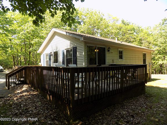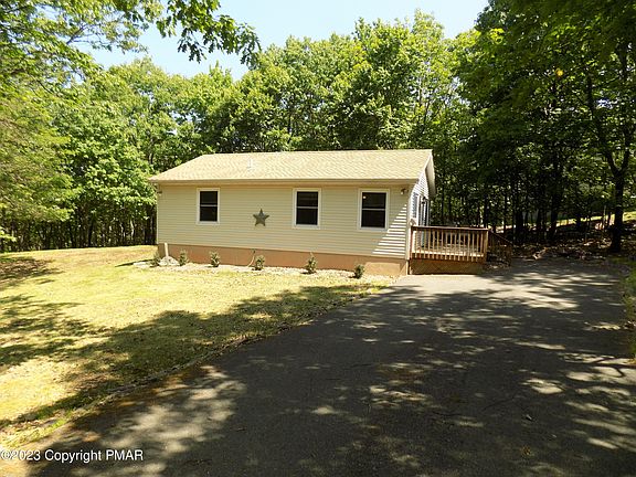 *VERBAL ACCEPTANCE* Here is your cabin in the woods, cozy 2 Bedroom, 1 bath ranch Ready to move in, Central air/heat pump, $5000 whole house water system, Shed, paved driveway, ceiling fan in Kitchen, Stove/refig and washer/dryer hook-ups. New flooring thur out, Super low taxes $1904 per year, association dues $1220 per year. 5 lakes, 2 pools, garbage pick-up, 24 guarded gates, located in short term friendly community near all major Pocono attractions
