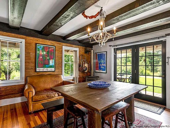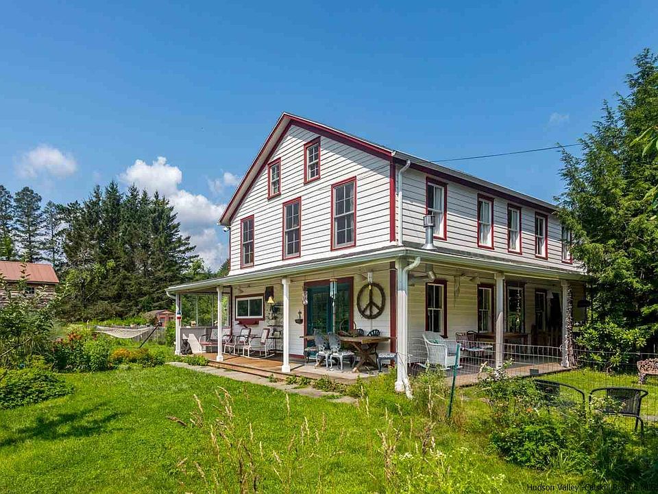 Tucked into the rolling hills of Woodstock, NY lies this historic five-bedroom home with a gorgeous full view of Mount Tobias, every season of the year. Built in 1855 and lovingly renovated over the years to preserve its vintage charm, this idyllic property boasts a beautiful cedar barn, magical flower and vegetable gardens, original hardwood floors, a full house and barn generator, and a charming wrap-around porch-- perfect for rocking chairs and lazy afternoons listening to the variety of birds who have made their own happy homes in the bird houses that top the fence posts. On the main level, a cozy living area sits next to the updated kitchen and dining room. The kitchen has been opened to create an eat-in feel-- enjoy dining at the bar or at the dining table just next to the gas fireplace. Whether sipping your coffee by the fire or standing at the kitchen sink, you will be mesmerized by the open farm field and stunning mountain view. Glass french doors fill the room with sunlight and lead out to the spacious yard. Overhead, the wood beams add a lovely, rustic farmhouse vibe. The main floor also includes a bedroom and a full bathroom with a claw foot tub. Upstairs there are four private bedrooms-- each with gleaming hardwood floors and large, sunny windows overlooking the countryside. The upstairs also features two full bathrooms-- one with a step-in shower and the other with a claw-foot tub. The large, walk-up attic is easily accessible from the second floor and has tremendous potential for adding additional usable space to the home. Sitting next to this beautiful home, surrounded by lilac bushes and fruit trees, lies the incredible, two-story cedar barn. This gorgeous full-floor, two-story space could be used for so many purposes-- talk about an artist's dream studio, this is definitely it! The approximately 2,000 sq ft barn includes a separate large studio, full bathroom, and radiant heated floors (the entire first floor of the barn is set up with radiant heat), making the possibilities for its many uses endless. The large, level yard next to the barn is the perfect spot to add a pool with a view. Located about 7 miles from historic downtown Woodstock and the quaint town of Phoenicia, this home puts you close to restaurants and shopping while still maintaining a private, secluded feel. And if hiking is your sport, you will discover within walking distance, the Willow Trailhead leading to the Mount Tremper fire tower, one of the noted Catskill hiking trails. If you're searching for that picture-perfect upstate New York hideaway, this home is it.