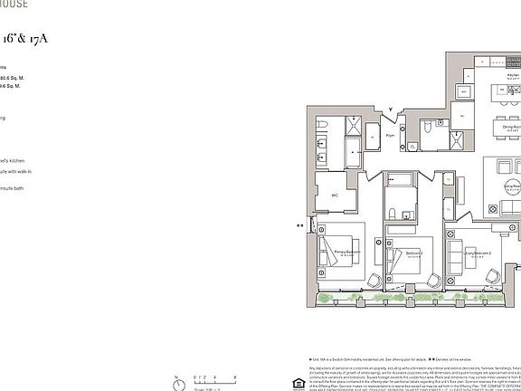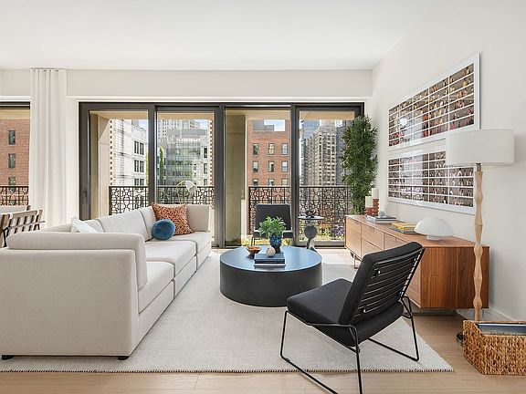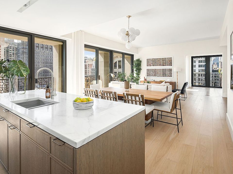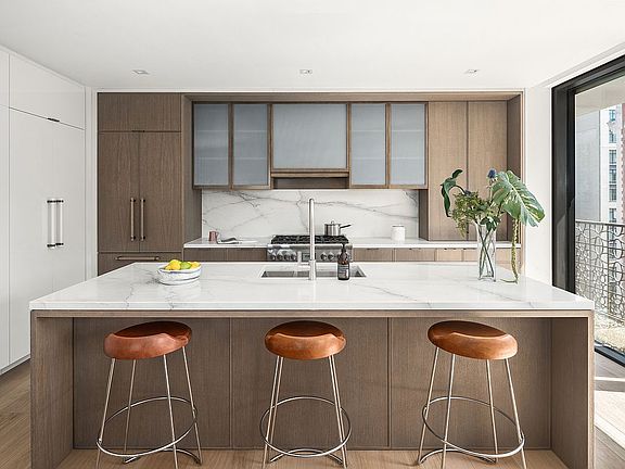 NEWLY PRICED! Designed by COOKFOX Architects and offering a 1,944 SF interior and 211 SF of planted and irrigated outdoor loggias, Residence 16A is a half-floor three-bedroom, three bathroom residence with sweeping landmark views from floor-to-ceiling windows. A gracious entry foyer leads to an open living and dining room with bright east exposures and views of The Clocktower offset by a planted loggia that runs the full length of the windows and accessible from the living room. The open kitchen features ample custom oak, lacquer, and ribbed glass cabinetry framed in brass, along with Calacatta Lincoln marble slab countertops and backsplashes. Appliances include a Thermador six burner gas range with a vented hood, a Bosch speed oven and dishwasher, and a Gaggenau refrigerator/freezer and full height wine refrigerator. The primary suite, on the south side of the residence, offers access to a second planted loggia and is generously sized with a large walk-in closet. A five-fixture primary bathroom a customer vanity, heated marble floors, a 6' Kohler bathtub, a glass-enclosed shower, and water closet by Toto. Two secondary bedrooms, one facing south and one facing south and east, overlook the planted loggia. The corner secondary bedroom offers direct loggia access. The ensuite secondary bath is finished with limestone flooring, Ann Sacks textured ceramic tiles, custom vanity, Duravit shower/tub, and water closet by Toto. The third bathroom is finished with Gaudi marble flooring and wainscoting with a rubbed limestone accent wall, a custom vanity, a shower, and a water closet by Toto. All bathrooms are outfitted Watermark oil rubbed bronze fittings. White oak wide plank flooring (5.5" to 9.5"), central heating and air cooling, washer and vented dryer, and ample storage complete this home. Flatiron House spans 23rd to 24th Street with two buildings linked by a planted garden and an architectural glass walkway. Residence 16A is situated in the 23rd Street tower building. Located at the crossroads of Chelsea and Flatiron neighborhoods, Flatiron House offers a unique opportunity to have it all in one of the city's most desirable locations. Flatiron House offers a suite of tranquil amenities all designed by COOKFOX including an attended lobby, a fitness center with an adjacent terrace, a lush planted garden, a residents' lounge, and a game room. Located just half a block from Madison Square Park, Flatiron House's location affords residents convenient access to some of the city's best restaurants, museums, galleries, and transportation. Renderings are for finishes and not representative of the floorplan.