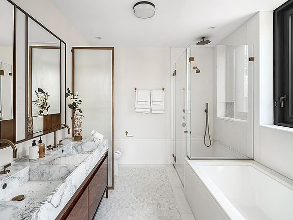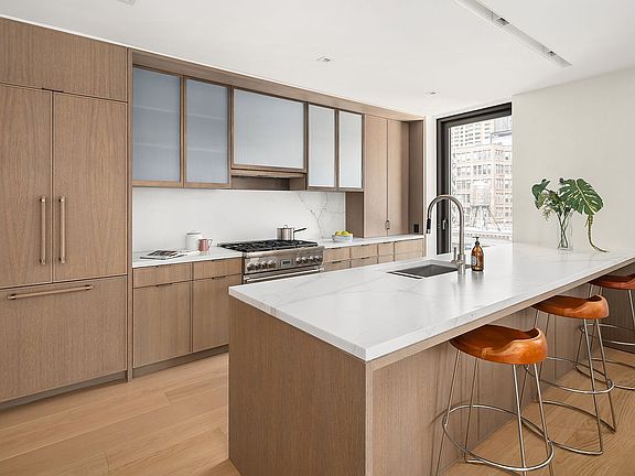 Designed by COOKFOX Architects and offering a 1,676 SF interior and 122 SF of planted and irrigated outdoor loggias, Residence 16B is half-floor two-bedroom, two-and-a-half bathroom residence with sweeping landmark views from floor-to-ceiling windows. A gracious entry foyer leads to an open living and dining room with bright east and north exposures and views of The Clocktower offset by a planted loggia, accessible from the living room, that runs the full length of the windows. The open kitchen features ample custom oak, lacquer, and ribbed glass cabinetry framed in brass, along with Calacatta Lincoln marble slab countertops and backsplashes. Appliances include a Thermador six burner gas range with a vented hood, a Bosch speed oven and dishwasher, and a Gaggenau refrigerator/freezer and full height wine refrigerator. The corner primary suite faces west and north toward the Empire State Building and is generously sized with a large windowed walk-in closet. A windowed five-fixture primary bathroom a customer vanity, heated marble floors, a 6' Kohler bathtub, a glass-enclosed shower, and water closet by Toto. The oversized secondary bedroom overlooks the planted loggia and offers an ensuite bath finished with limestone flooring, Ann Sacks textured ceramic tiles, custom vanity, Duravit shower/tub, and water closet by Toto. The powder room is finished with Gaudi marble flooring and wainscoting with a rubbed limestone accent wall, a custom vanity, and a water closet by Toto. All bathrooms are outfitted Watermark oil rubbed bronze fittings. White oak wide plank flooring (5.5" to 9.5"), central heating and air cooling, washer and vented dryer, and ample storage complete this home.
