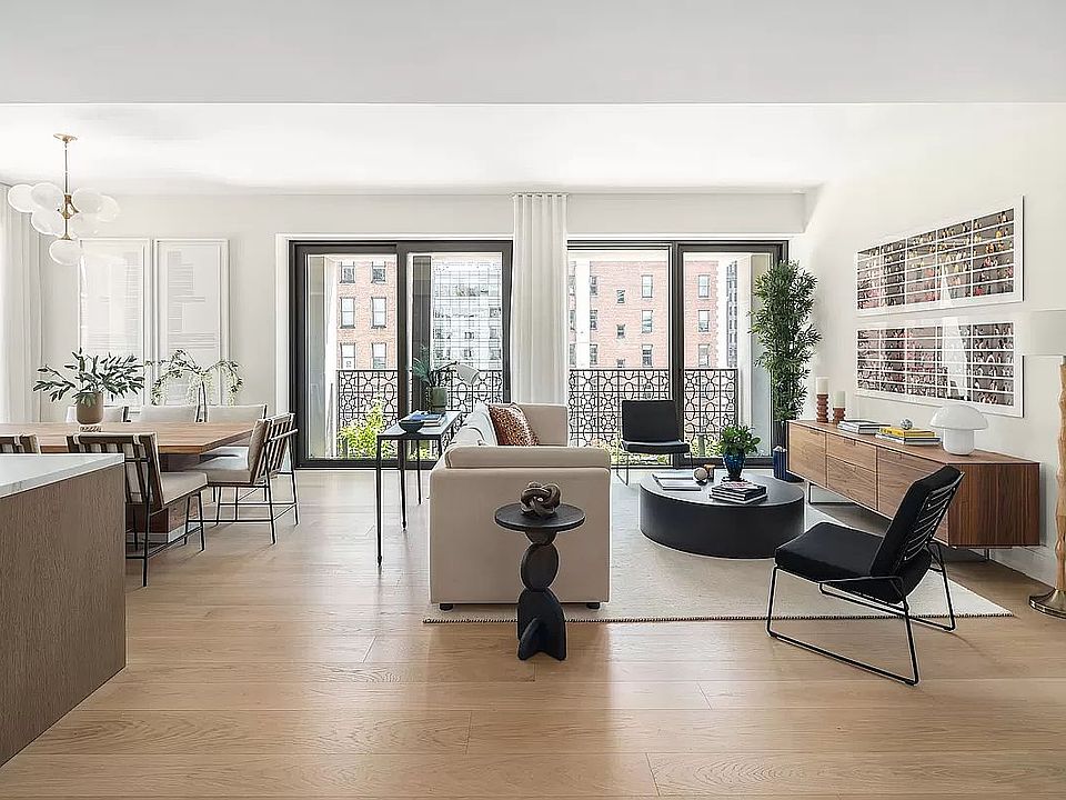 Designed by COOKFOX Architects and offering a 1,676 SF interior and 122 SF of planted and irrigated outdoor loggias, Residence 17B is half-floor two-bedroom, two-and-a-half bathroom residence with sweeping landmark views from floor-to-ceiling windows. A gracious entry foyer leads to an open living and dining room with bright east and north exposures and views of The Clocktower offset by a planted loggia, accessible from the living room, that runs the full length of the windows. The open kitchen features ample custom oak, lacquer, and ribbed glass cabinetry framed in brass, along with Calacatta Lincoln marble slab countertops and backsplashes. Appliances include a Thermador six burner gas range with a vented hood, a Bosch speed oven and dishwasher, and a Gaggenau refrigerator/freezer and full height wine refrigerator. The corner primary suite faces west and north toward the Empire State Building and is generously sized with a large windowed walk-in closet. A windowed five-fixture primary bathroom a customer vanity, heated marble floors, a 6' Kohler bathtub, a glass-enclosed shower, and water closet by Toto. The oversized secondary bedroom overlooks the planted loggia and offers an ensuite bath finished with limestone flooring, Ann Sacks textured ceramic tiles, custom vanity, Duravit shower/tub, and water closet by Toto. The powder room is finished with Gaudi marble flooring and wainscoting with a rubbed limestone accent wall, a custom vanity, and a water closet by Toto. All bathrooms are outfitted Watermark oil rubbed bronze fittings. White oak wide plank flooring (5.5" to 9.5"), central heating and air cooling, washer and vented dryer, and ample storage complete this home.