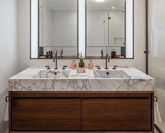 Overlooking Flatiron House's lush central garden, this oversized residence enjoys the privacy of being one of only two homes on the floor. Designed by COOKFOX Architects, this 1,052 square foot one bedroom, one- and a half-bathroom home features a gracious living / dining area complete with wet bar concealed behind custom millwork. The open, windowed kitchen with a peninsula island features ample custom oak, lacquer, and ribbed glass cabinetry framed in brass, along with Calacatta Lincoln marble slab countertops and backsplashes. Appliances include a Thermador gas range with a vented hood, Bosch speed oven and dishwasher, Gaggenau refrigerator/freezer, and an undercounter wine refrigerator. The primary suite boasts a large walk-in-closet that leads into a five-fixture bathroom with a custom double sink vanity complemented by Watermark oil rubbed bronze fittings, heated marble floors, a 6' Kohler bathtub, a glass-enclosed shower, and water closet by Toto. White oak wide plank flooring (5.5" to 9.5"), central heating and air cooling and a washer and dryer complete this residence. Flatiron House spans 23rd to 24th Street with two buildings linked by a planted garden and an architectural glass walkway. Residence 8B is situated in the 23rd Street tower. Located at the crossroads of Chelsea and Flatiron neighborhoods, Flatiron House offers a unique opportunity to have it all in one of the city's most desirable locations. Flatiron House offers a suite of tranquil amenities all designed by COOKFOX including an attended lobby, a fitness center with an adjacent terrace, a lush planted garden, a residents' lounge, and a game room. Located just half a block from Madison Square Park, Flatiron House's location affords residents convenient access to some of the city's best restaurants, museums, galleries, and transportation. Renderings are for finishes and not representative of the floorplan.