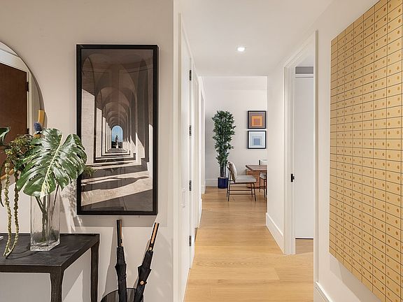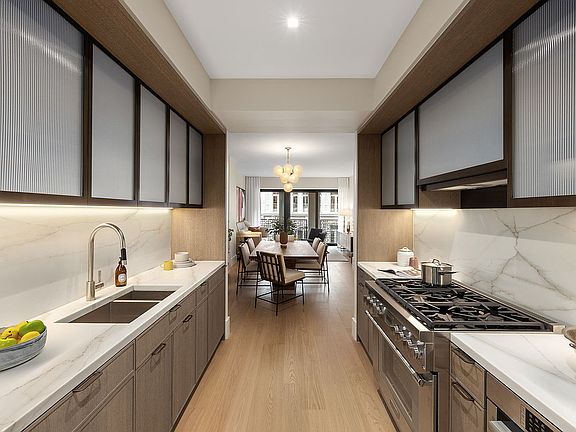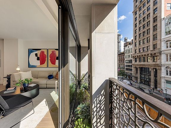 NEWLY PRICED! Flooded with light, this half-floor home enjoys southern and eastern views through floor-to-ceiling-windows accented by Flatiron House’s signature planted loggias. Designed by COOKFOX Architects, this 1,599 square foot two- bedroom, two-and a half-bath residence features a living room with a separate dining area, and an adjacent flexible 9 pocket doors) secondary living space or second bedroom with an ensuite bathroom. The custom kitchen with windowed breatkfast dining area features ample custom oak, lacquer, and ribbed glass cabinetry framed in brass, along with Calacatta Lincoln marble slab countertops and backsplashes. Appliances include a Thermador six-burner gas range with a vented hood, Bosch speed oven and dishwasher, Gaggenau refrigerator/freezer, and an undercounter wine refrigerator. The primary suite boasts a large walk-in-closet that leads into a five-fixture bathroom with a custom double sink vanity complemented by Watermark oil rubbed bronze fittings, heated marble floors, a 6’ Kohler bathtub, a oversized glass-enclosed shower, and water closet by Toto. The second bathroom (also ensuite) is finished with limestone flooring, Ann Sacks textured ceramic tiles, custom vanity, Duravit shower/tub, and water closet by Toto. White oak wide plank flooring (5.5" to 9.5"), central heating and air cooling and in residence washer and dryer complete this residence.