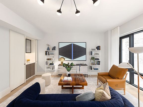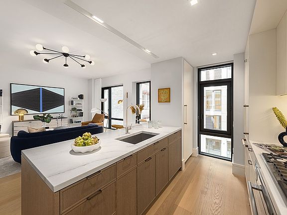Overlooking Flatiron House's lush central garden, this oversized residence enjoys the privacy of being one of only two homes on the floor. Designed by COOKFOX Architects, this 1,050 square foot one bedroom, one-and a half-bathroom home features a gracious living / dining area complete with wet bar concealed behind custom millwork. The open, windowed kitchen with a peninsula island features ample custom oak, lacquer, and ribbed glass cabinetry framed in brass, along with Calacatta Lincoln marble slab countertops and backsplashes. Appliances include a Thermador gas range with a vented hood, Bosch speed oven and dishwasher, Gaggenau refrigerator/freezer, and an undercounter wine refrigerator. The primary suite boasts a large walk-in-closet that leads into a five-fixture bathroom with a custom double sink vanity complemented by Watermark oil rubbed bronze fittings, heated marble floors, a 6' Kohler bathtub, a glass-enclosed shower, and water closet by Toto. White oak wide plank flooring (5.5" to 9.5"), central heating and air cooling and a washer and dryer complete this residence.