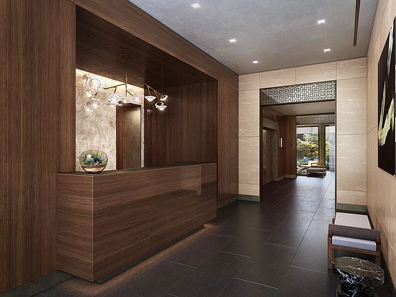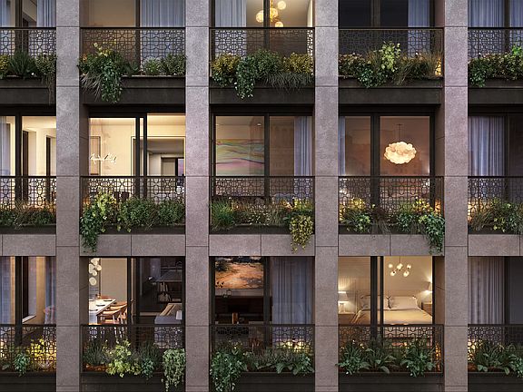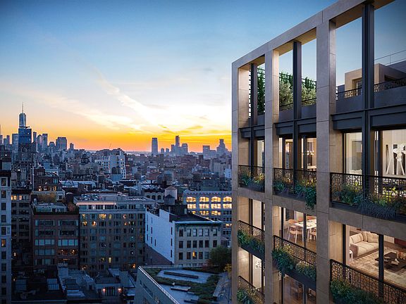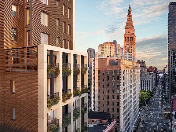 Flooded with light, this half-floor home enjoys southern views through floor-to-ceiling-windows accented by Flatiron House's signature planted loggias. Designed by COOKFOX Architects, this 1,672 square foot two- bedroom, two-and a half-bath residence features a gracious living area with a separate dining area. The custom kitchen features ample custom oak, lacquer, and ribbed glass cabinetry framed in brass, along with Calacatta Lincoln marble slab countertops and backsplashes. Appliances include a Thermador six-burner gas range with a vented hood, Bosch speed oven and dishwasher, Gaggenau refrigerator/freezer, and an undercounter wine refrigerator. The primary suite boasts a large walk-in-closet that leads into a five-fixture bathroom with a custom double sink vanity, heated marble floors, a 6' Kohler bathtub, a glass-enclosed shower, and water closet by Toto. The secondary bathroom is finished with limestone flooring, Ann Sacks textured ceramic tiles, custom vanity, Duravit shower/tub, and water closet by Toto. All bathrooms are outfitted Watermark oil rubbed bronze fittings. White oak wide plank flooring (5.5" to 9.5"), central heating and air cooling and a large laundry room with a washer and dryer complete this residence. Flatiron House spans 23rd to 24th Street with two buildings linked by a planted garden and an architectural glass walkway. Residence 14A is situated in the 23rd Street tower. Located at the crossroads of Chelsea and Flatiron neighborhoods, Flatiron House offers a unique opportunity to have it all in one of the city's most desirable locations. Flatiron House offers a suite of tranquil amenities all designed by COOKFOX including an attended lobby, a fitness center with an adjacent terrace, a lush planted garden, a residents' lounge, and a game room. Located just half a block from Madison Square Park, Flatiron House's location affords residents convenient access to some of the city's best restaurants, museums, galleries, and transportation. Renderings are for finishes and not representative of the floorplan.