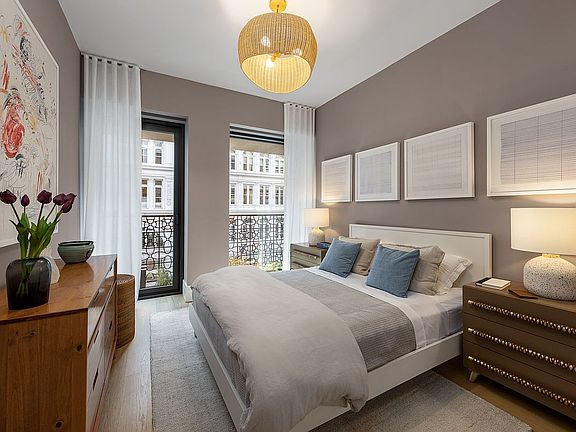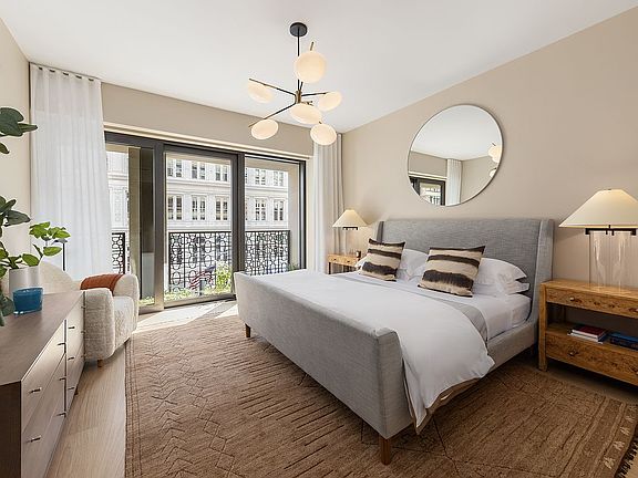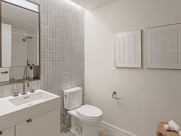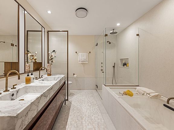 Flooded with light, this half-floor home enjoys southern views through floor-to-ceiling-windows accented by Flatiron House's signature planted loggias. Designed by COOKFOX Architects, this 1,672 square foot two- bedroom, two-and a half-bath residence features a living room with a separate dining area, and an adjacent flexible secondary living space or second bedroom with an ensuite bathroom. The bathroom is finished with limestone flooring, Ann Sacks textured ceramic tiles, custom vanity, Duravit shower/tub, and water closet by Toto. The custom kitchen features ample custom oak, lacquer, and ribbed glass cabinetry framed in brass, along with Calacatta Lincoln marble slab countertops and backsplashes. Appliances include a Thermador six-burner gas range with a vented hood, Bosch speed oven and dishwasher, Gaggenau refrigerator/freezer, and an undercounter wine refrigerator. The primary suite boasts a large walk-in-closet that leads into a five-fixture bathroom with a custom double sink vanity complemented by Watermark oil rubbed bronze fittings, heated marble floors, a 6' Kohler bathtub, a glass-enclosed shower, and water closet by Toto. White oak wide plank flooring (5.5" to 9.5"), central heating and air cooling and a large laundry room with a washer and dryer complete this residence.