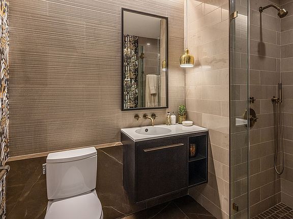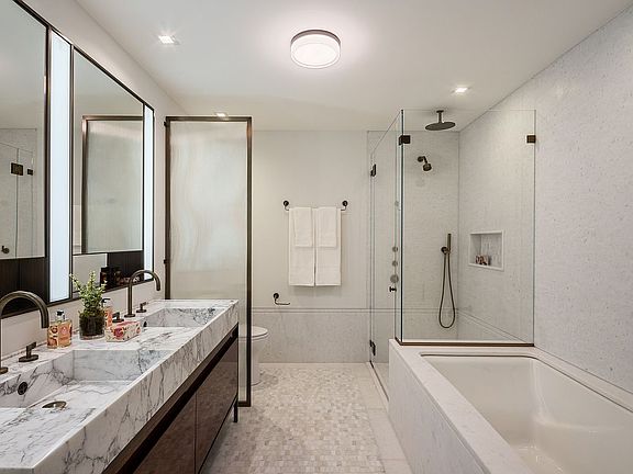 Designed by COOKFOX Architects and offering a 1,676 SF interior and 122 SF of planted and irrigated outdoor loggias, Residence 18B is half-floor two-bedroom, two-and-a-half bathroom residence with sweeping landmark views from floor-to-ceiling windows. A gracious entry foyer leads to an open living and dining room with bright east and north exposures and views of The Clocktower offset by a planted loggia, accessible from the living room, that runs the full length of the windows. The open kitchen features ample custom oak, lacquer, and ribbed glass cabinetry framed in brass, along with Calacatta Lincoln marble slab countertops and backsplashes. Appliances include a Thermador six burner gas range with a vented hood, a Bosch speed oven and dishwasher, and a Gaggenau refrigerator/freezer and full height wine refrigerator. The corner primary suite faces west and north toward the Empire State Building and is generously sized with a large windowed walk-in closet. A windowed five-fixture primary bathroom a customer vanity, heated marble floors, a 6' Kohler bathtub, a glass-enclosed shower, and water closet by Toto. The oversized secondary bedroom overlooks the planted loggia and offers an ensuite bath finished with limestone flooring, Ann Sacks textured ceramic tiles, custom vanity, Duravit shower/tub, and water closet by Toto. The powder room is finished with Gaudi marble flooring and wainscoting with a rubbed limestone accent wall, a custom vanity, and a water closet by Toto. All bathrooms are outfitted Watermark oil rubbed bronze fittings. White oak wide plank flooring (5.5" to 9.5"), central heating and air cooling, washer and vented dryer, and ample storage complete this home. Flatiron House spans 23rd to 24th Street with two buildings linked by a planted garden and an architectural glass walkway. Residence 18B is situated in the 23rd Street tower building. Located at the crossroads of Chelsea and Flatiron neighborhoods, Flatiron House offers a unique opportunity to have it all in one of the city's most desirable locations. Flatiron House offers a suite of tranquil amenities all designed by COOKFOX including an attended lobby, a fitness center with an adjacent terrace, a lush planted garden, a residents' lounge, and a game room. Located just half a block from Madison Square Park, Flatiron House's location affords residents convenient access to some of the city's best restaurants, museums, galleries, and transportation. Renderings are for finishes and not representative of the floorplan.