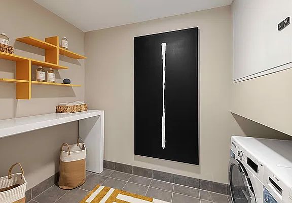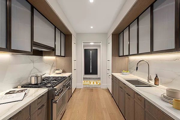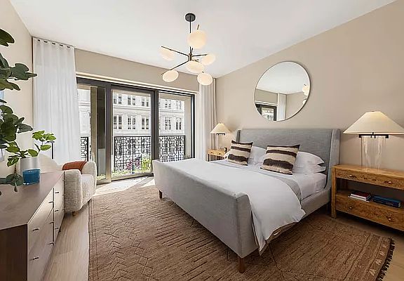 Flooded with light, this half-floor home enjoys southern views through floor-to-ceiling-windows accented by Flatiron House's signature planted loggias. Designed by COOKFOX Architects, this 1,607 square foot two- bedroom, two-and a half-bath residence features a living room with a separate dining area, and an adjacent flexible secondary living space or second bedroom with an ensuite bathroom. The bathroom is finished with limestone flooring, Ann Sacks textured ceramic tiles, custom vanity, Duravit shower/tub, and water closet by Toto. The custom kitchen features ample custom oak, lacquer, and ribbed glass cabinetry framed in brass, along with Calacatta Lincoln marble slab countertops and backsplashes. Appliances include a Thermador six-burner gas range with a vented hood, Bosch speed oven and dishwasher, Gaggenau refrigerator/freezer, and an undercounter wine refrigerator. The primary suite boasts a large walk-in-closet that leads into a five-fixture bathroom with a custom double sink vanity complemented by Watermark oil rubbed bronze fittings, heated marble floors, a 6' Kohler bathtub, a glass-enclosed shower, and water closet by Toto. White oak wide plank flooring (5.5" to 9.5"), central heating and air cooling and a large laundry room with a washer and dryer complete this residence. Flatiron House spans 23rd to 24th Street with two buildings linked by a planted garden and an architectural glass walkway. Residence 3A is situated in the 23rd Street tower. Located at the crossroads of Chelsea and Flatiron neighborhoods, Flatiron House offers a unique opportunity to have it all in one of the city's most desirable locations. Flatiron House offers a suite of tranquil amenities all designed by COOKFOX including an attended lobby, a fitness center with an adjacent terrace, a lush planted garden, a residents' lounge, and a game room. Located just half a block from Madison Square Park, Flatiron House's location affords residents convenient access to some of the city's best restaurants, museums, galleries, and transportation. Renderings are for finishes and not representative of the floorplan.
