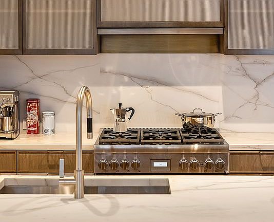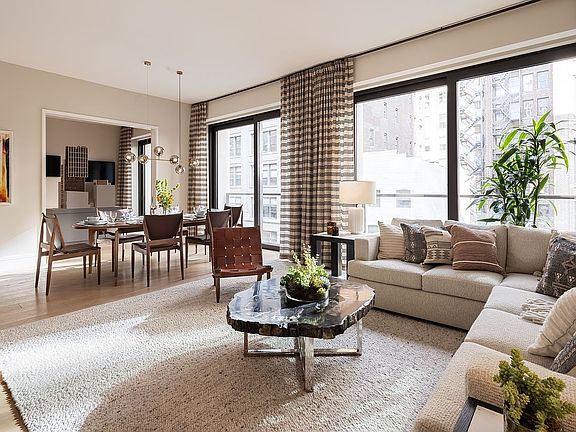 Privacy abounds in this full-floor, lofty home with direct elevator entry! Designed by COOKFOX Architects, this bright 2,036 square foot three-bedroom, three bathroom residence maximizes light and views through floor-to-ceiling windows in each room, north and south exposures, and high ceilings. The elevator opens into a foyer which flows into a spacious living and dining area facing West 24th Street. The open kitchen features ample custom oak, lacquer, and ribbed glass cabinetry framed in brass, along with Calacatta Lincoln marble slab countertops and backsplashes. Appliances include a Thermador six burner gas range with a vented hood, Bosch speed oven and dishwasher, and Gaggenau refrigerator/freezer and full height wine refrigerator. The primary suite, on the south side of the residence, is generously sized with a large walk-in closet. A five-fixture primary bathroom features a custom vanity, heated marble floors, a 6' Kohler bathtub, a glass-enclosed shower, and water closet by Toto. The secondary bath is finished with limestone flooring, Ann Sacks textured ceramic tiles, custom vanity, Duravit shower/tub, and water closet by Toto. The third bathroom is finished with Gaudi marble flooring and wainscoting with a rubbed limestone accent wall, custom vanity, shower and water closet by Toto. All bathrooms are outfitted Watermark oil rubbed bronze fittings. White oak wide plank flooring (5.5" to 9.5"), central heating and air cooling, washer and vented dryer, and ample storage complete this home. Flatiron House spans 23rd to 24th Street with two buildings linked by a planted garden and an architectural glass walkway. Residence 601 is situated in the 24th Street loft building. Located at the crossroads of Chelsea and Flatiron neighborhoods, Flatiron House offers a unique opportunity to have it all in one of the city's most desirable locations. Flatiron House offers a suite of tranquil amenities all designed by COOKFOX including an attended lobby, a fitness center with an adjacent terrace, a lush planted garden, a residents' lounge, and a game room. Located just half a block from Madison Square Park, Flatiron House's location affords residents convenient access to some of the city's best restaurants, museums, galleries, and transportation. Renderings are for finishes and not representative of the floorplan.