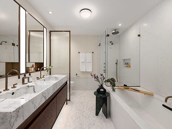 Overlooking Flatiron House's lush central garden, this oversized residence enjoys the privacy of being one of only two homes on the floor. Designed by COOKFOX Architects, this 1,052 square foot one bedroom, one-and a half-bathroom home features a gracious living / dining area complete with wet bar concealed behind custom millwork. The open, windowed kitchen with a peninsula island features ample custom oak, lacquer, and ribbed glass cabinetry framed in brass, along with Calacatta Lincoln marble slab countertops and backsplashes. Appliances include a Thermador gas range with a vented hood, Bosch speed oven and dishwasher, Gaggenau refrigerator/freezer, and an undercounter wine refrigerator. The primary suite boasts a large walk-in-closet that leads into a five-fixture bathroom with a custom double sink vanity complemented by Watermark oil rubbed bronze fittings, heated marble floors, a 6' Kohler bathtub, a glass-enclosed shower, and water closet by Toto. White oak wide plank flooring (5.5" to 9.5"), central heating and air cooling and a washer and dryer complete this residence. Flatiron House spans 23rd to 24th Street with two buildings linked by a planted garden and an architectural glass walkway. Residence 6B is situated in the 23rd Street tower. Located at the crossroads of Chelsea and Flatiron neighborhoods, Flatiron House offers a unique opportunity to have it all in one of the city's most desirable locations. Flatiron House offers a suite of tranquil amenities all designed by COOKFOX including an attended lobby, a fitness center with an adjacent terrace, a lush planted garden, a residents' lounge, and a game room. Located just half a block from Madison Square Park, Flatiron House's location affords residents convenient access to some of the city's best restaurants, museums, galleries, and transportation. Renderings are for finishes and not representative of the floorplan.