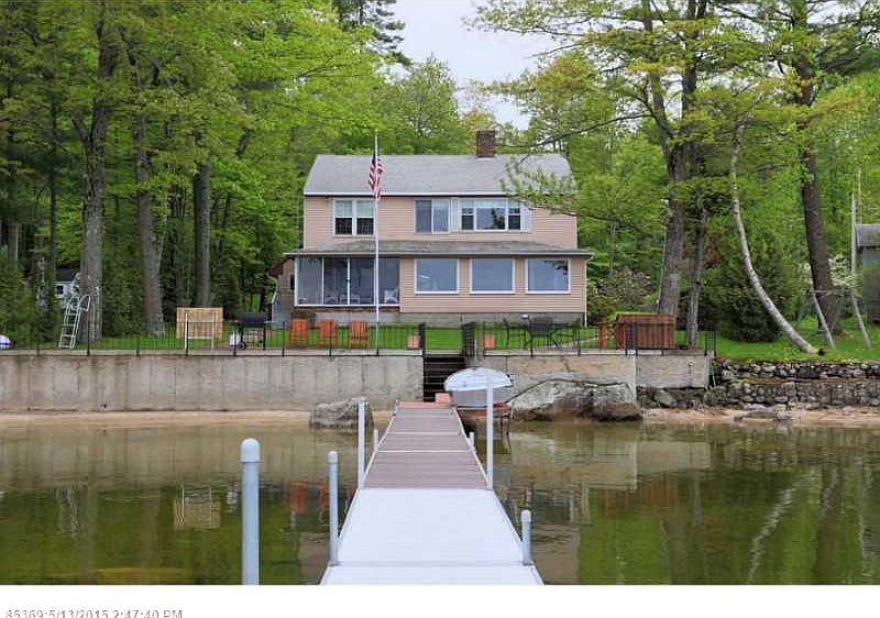 Year round Sebago Lake property with incredible water views! 74 feet of sandy beach frontage with dock. Amenities include an eat-in kitchen with granite, red birch cabinets, living room and dining room with wood burning fireplaces, master bedroom with sitting area, den with sliders to porch, deck, patio & beautifully landscaped grounds, with potential to finish above garage.