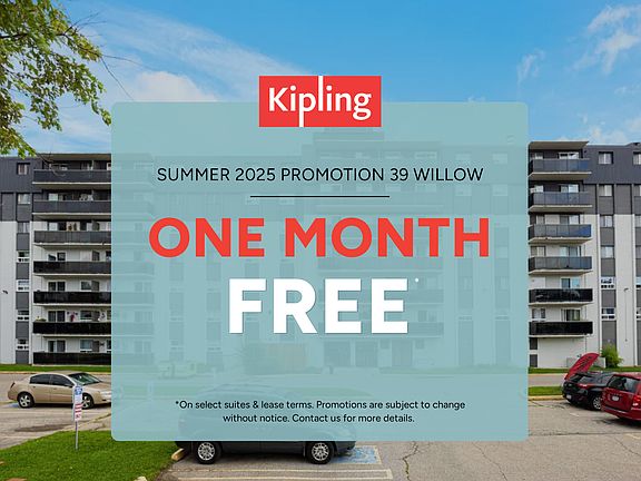AboutReceive 1 Month Free!* Located in central Guelph, 39 Willow Road offers large, open-concept, newly renovated 1 and 2-bedroom apartments. These suites feature large, bright windows, spacious closets, new glass balconies, hardwood and laminate flooring, updated lighting, and newly renovated kitchens and bathrooms.Residents enjoy a variety of amenities:On-site laundry facilities24-hour video surveillanceProfessional on-site managementParking for residents and visitorsElevatorsBuzzer entryBike storageThe building's prime location ensures easy access to essential services and leisure activities. A bus stop is just a 1-minute walk away, Exhibition Park is a 5-minute walk, and Willow West Mall is an 8-minute walk. Additionally, the University of Guelph is an 8-minute drive away, making it convenient for students.*On select suites & lease terms. Promotions are subject to change without notice. Contact us for more details.Community AmenitiesOutdoor parkingElevatorsOn-site staffLaundry facilitiesPrivate yardAssigned ParkingBuzzer EntrySuite AmenitiesBalconiesMicrowaveStainless steel appliancesHeat & Water IncludedUtilities IncludedHeat